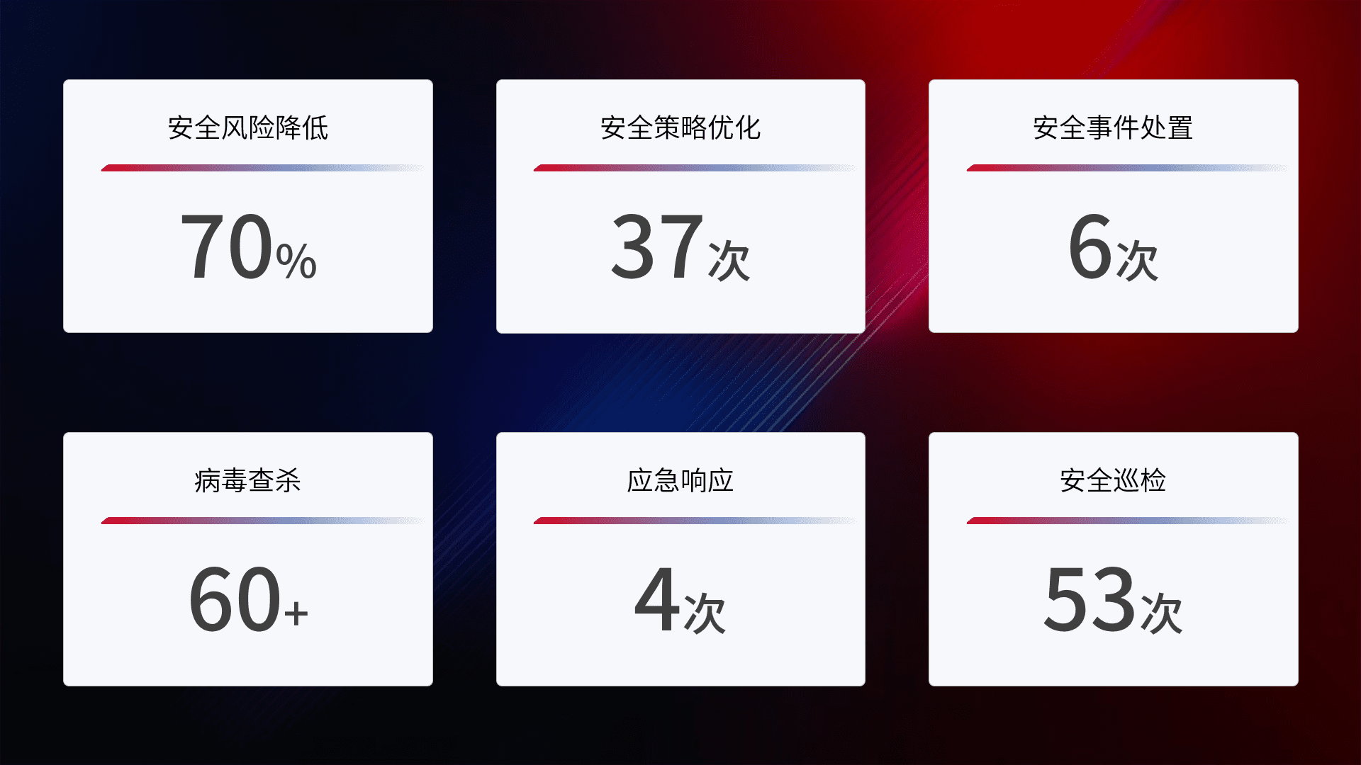提供全面的安全事件报告体系,,包括处置报告、、、、周报、、、、季度和年度总结,,,,结合持续监控,,帮助客户深入了解网络安全状况。。。。